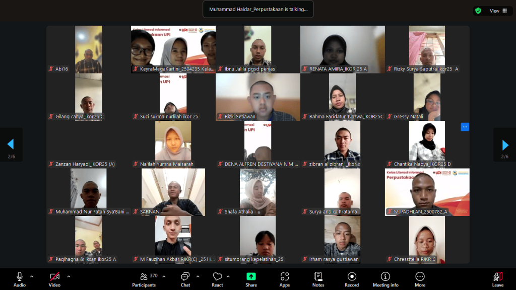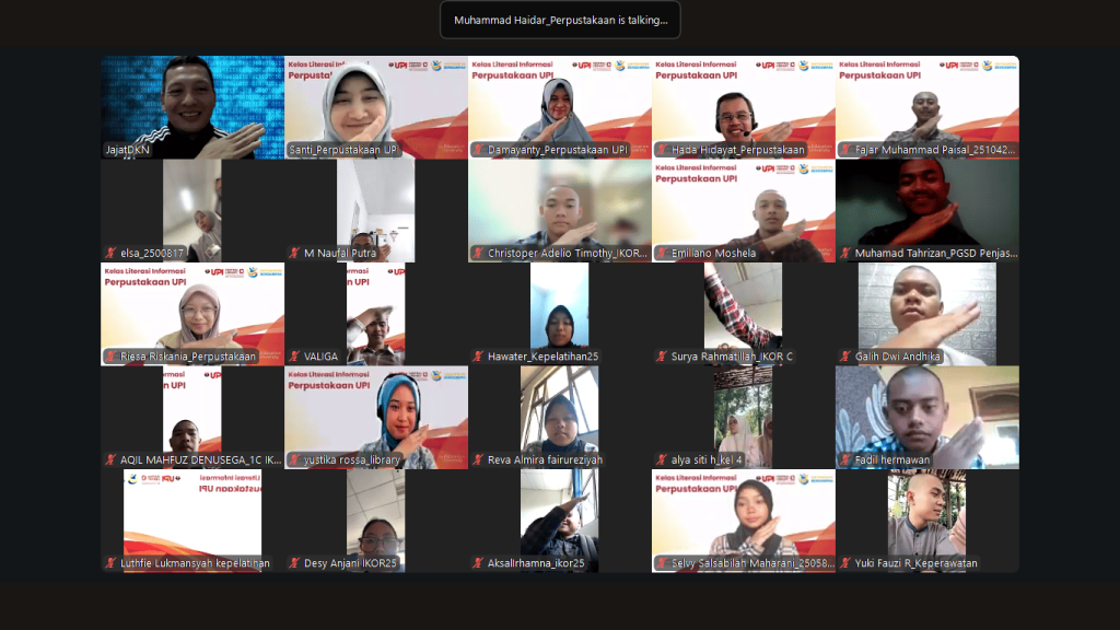 Bandung, 12 September 2025 – Perpustakaan Universitas Pendidikan Indonesia (UPI) kembali menggelar Kelas Literasi Dasar yang ditujukan untuk mahasiswa baru Fakultas Pendidikan Olahraga dan Kesehatan (FPOK). Kegiatan yang berlangsung secara daring melalui zoom pada hari Jumat, 12 September 2025 pukul 09.00–11.00 WIB ini diikuti oleh 400 peserta, dengan tujuan meningkatkan pemahaman literasi informasi, literasi ini merupakan hal yang sangat penting. Dengan kemampuan literasi yang baik, seseorang tidak hanya mampu memahami informasi, tetapi juga mengolah, mengkritisi, dan mengembangkannya menjadi gagasan baru yang bermanfaat.